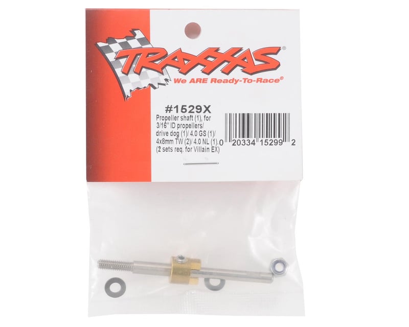 The 1529X 4 mm prop shaft with drive dog features a threaded end to install aftermarket props with a 3/16” inner diameter. Includes 4 mm grub screw (1), 4x8 mm PTFE washers (2) and a 4 mm nylon locknut. (Fits Villain IV, Villain EX (2 sets required), Blas