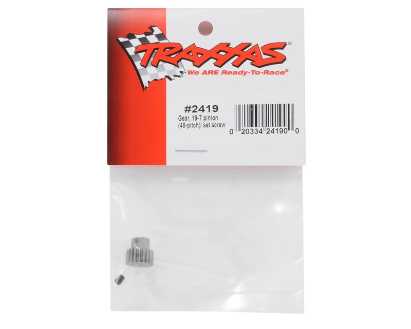 19-tooth pinion gear (48-pitch) fits 3 mm motor shafts and includes set screw. Traxxas pinion gears let you fine-tune the performance of your Traxxas model. Changing gear ratios can help balance acceleration and top speed for different running conditions.