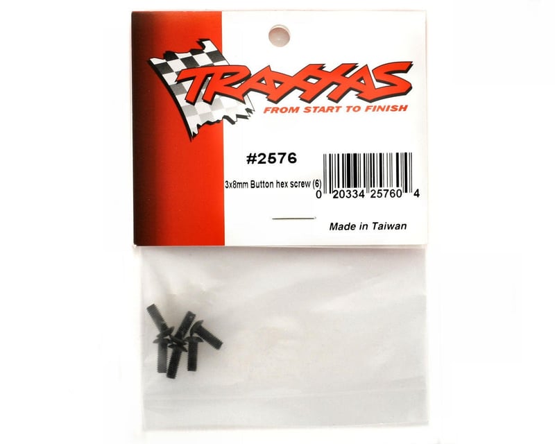 3x8 mm button-head machine screws with hex drive heads. Set of six.