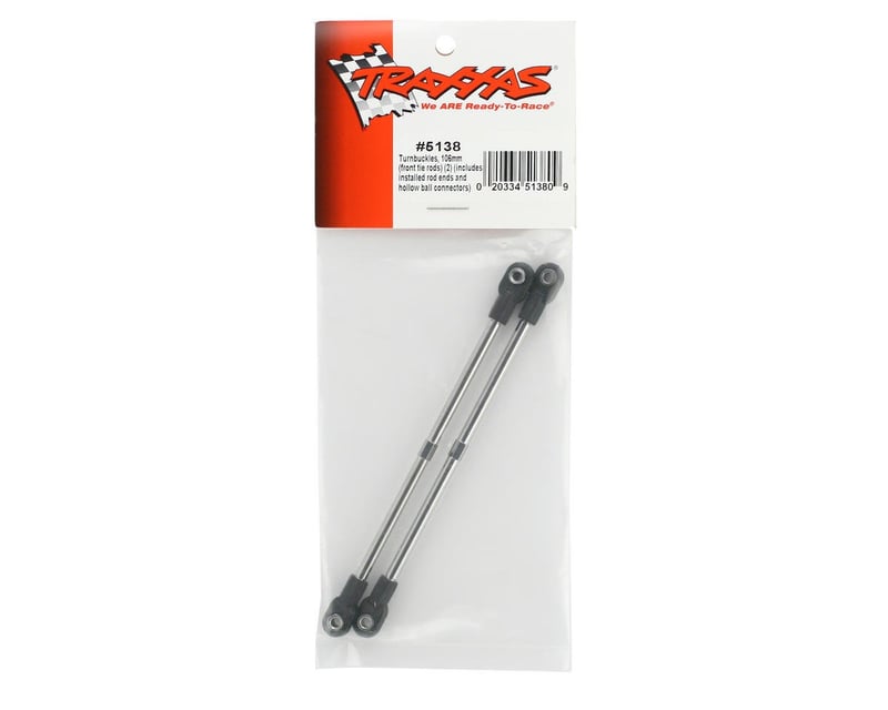 Pair of 106 mm steering tie rods come assembled with rod ends and hollow balls.