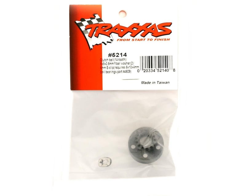 The 14-tooth (1.0 metric pitch) clutch bell is made from durable steel for long-lasting performance. Includes 5x8x.5 mm fiber washer and 5 mm E-clips (2). Clutch bells are available in a variety of sizes to fine-tune your truck's gear ratios for more torq