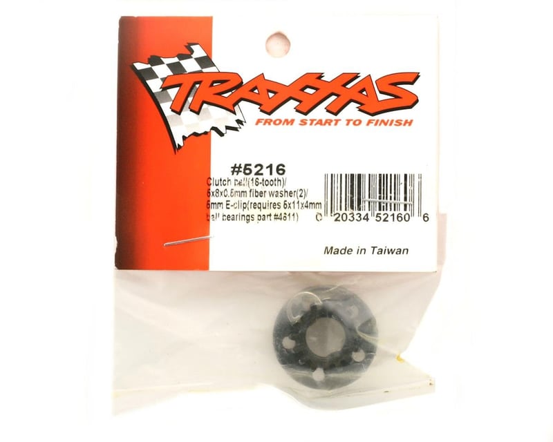 The 16-tooth (1.0 metric pitch) clutch bell is made from durable steel for long-lasting performance. Includes 5x8x.5 mm fiber washer and 5 mm E-clips (2). Clutch bells are available in a variety of sizes to fine-tune your truck's gear ratios for more torq