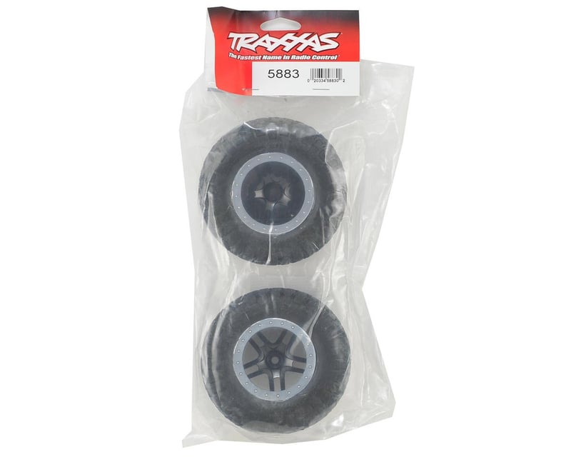 Replica BFGoodrich® Mud-Terrain™ T/A® KM2 tires come pre-glued and mounted with foam inserts to black Split-Spoke SCT wheels with satin chrome beadlock-style trim. Sold as a pair.