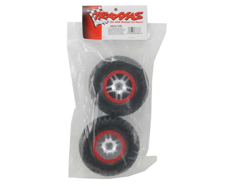 Ultra-soft S1-compound BFGoodrich® Mud-Terrain™ T/A® KM2 tires come pre-glued and mounted with foam inserts to chrome Split-Spoke SCT wheels with red beadlock-style trim. Sold as a pair.