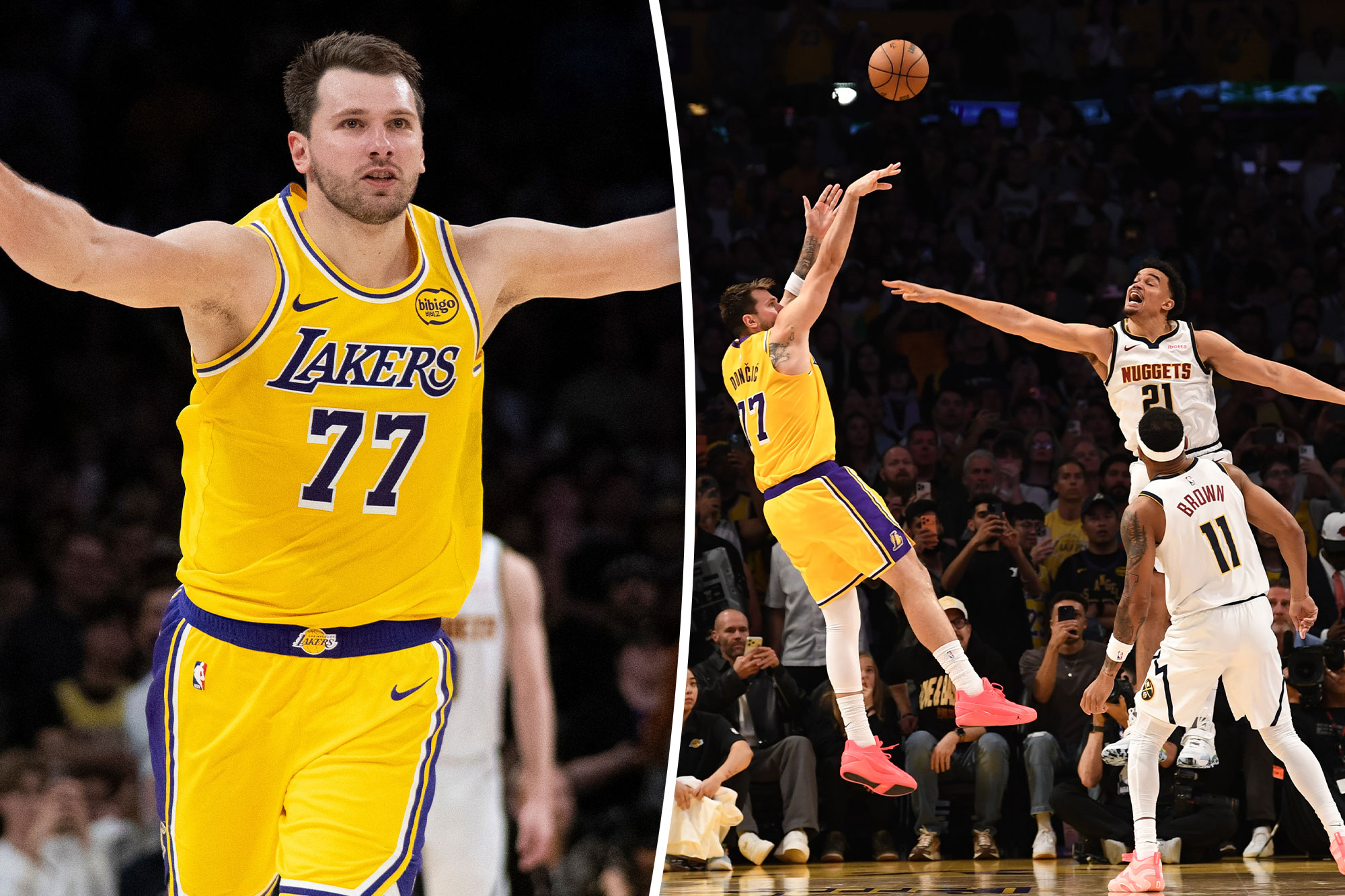 Lakers’ Luka Dončić shoots the game-winning against the Denver Nuggets on March 14 at Crypto.com Arena in LA. NBAE via Getty Images Survey the options as the Nuggets send the double team.