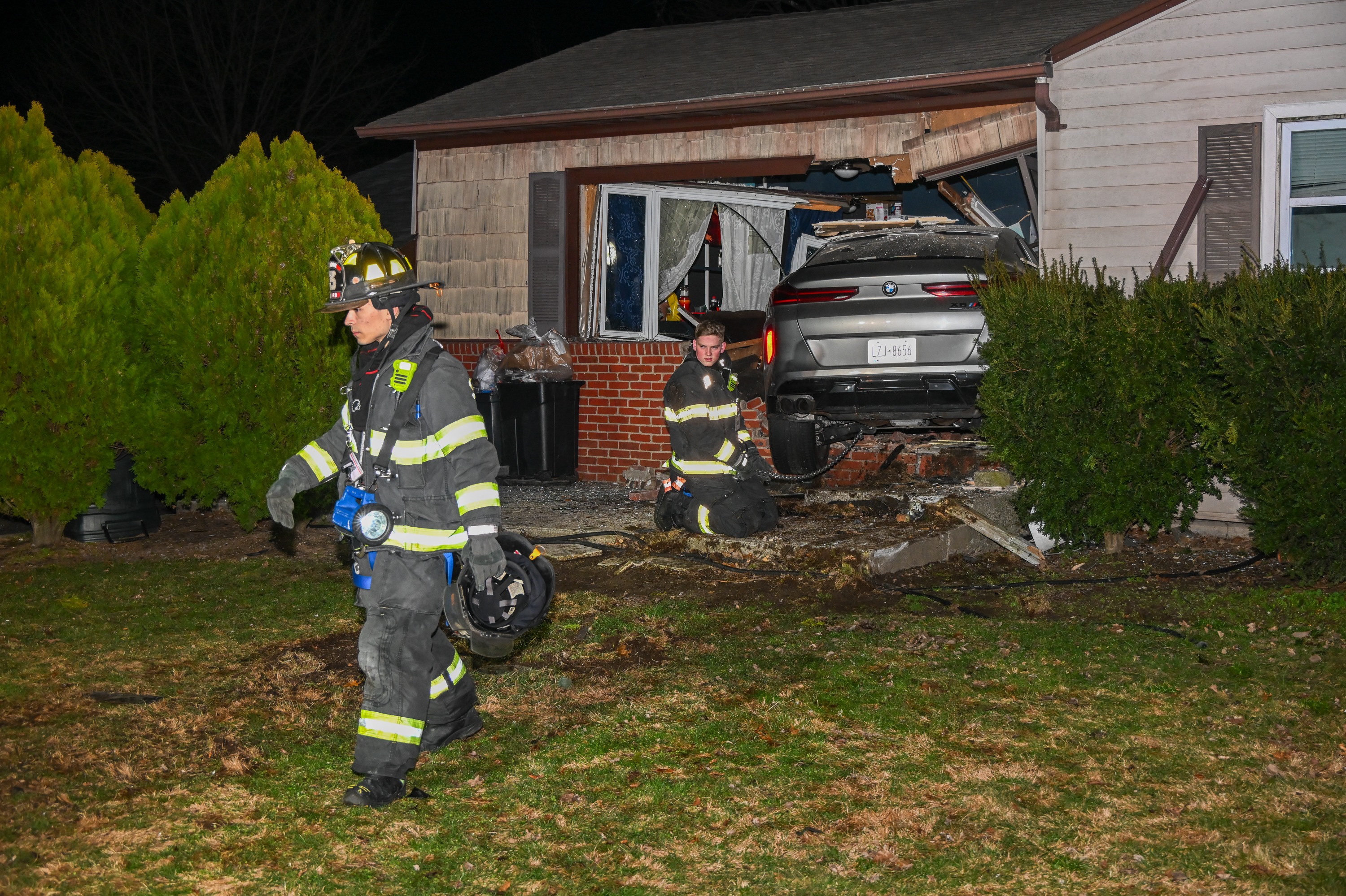 Photos from the scene show first responders examining the wreckage, with the front half of the vehicle inside the house and the back half sticking out with the rear wheels above the ground.