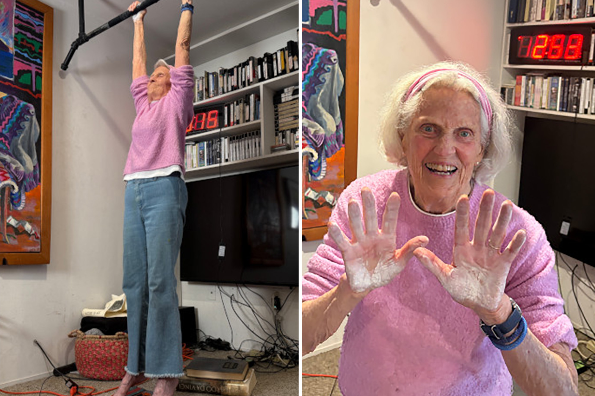 Although she would sometime hang from a bar to work on her posture, it was her son Rip, who started a challenge he dubbed, “Hanging with Rip,” that motivated her to attempt the world record.