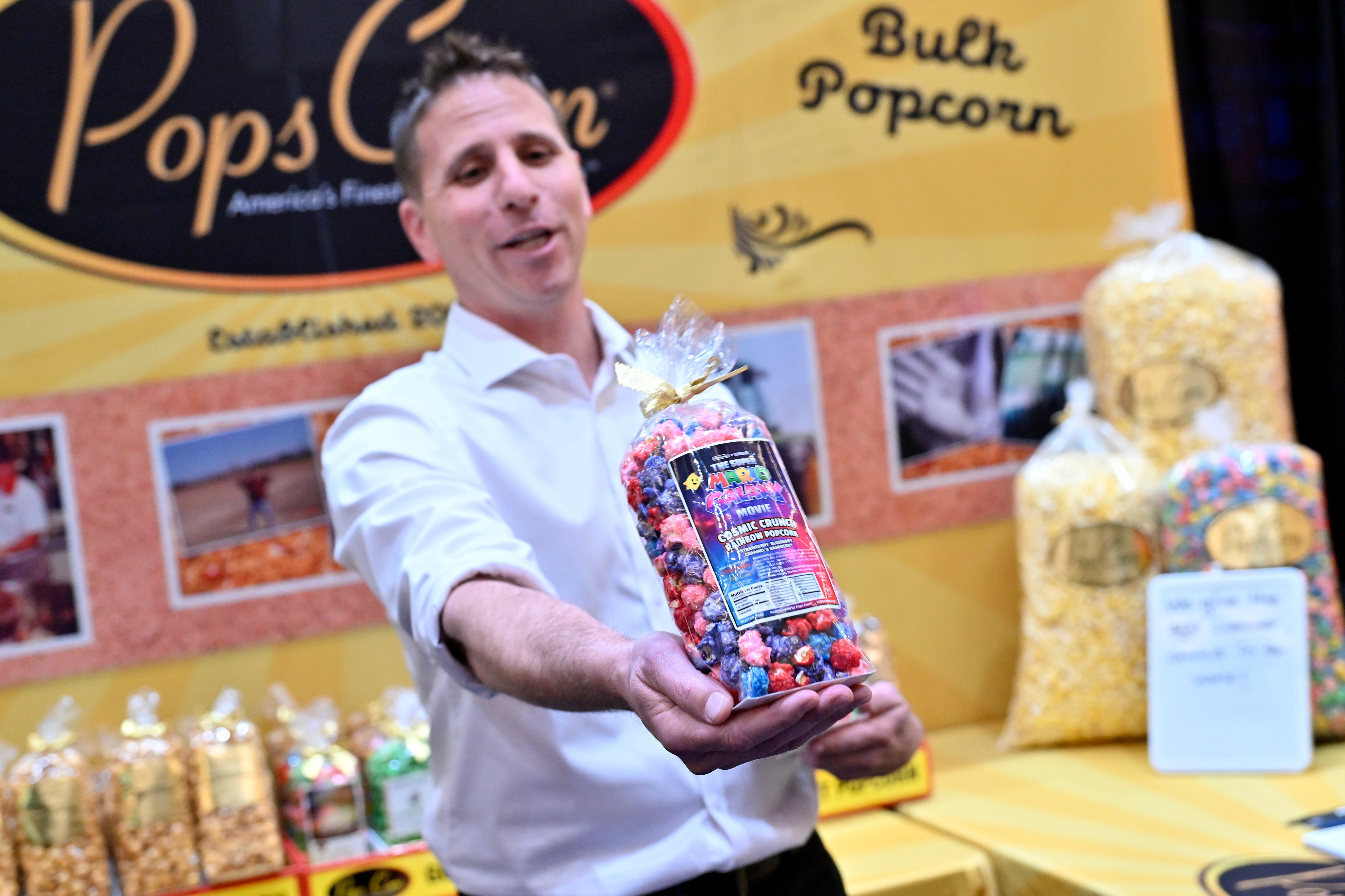 For Lee Feldman, founder of Pops Corn, it’s all about creating bespoke popcorn products for tentpole films – like his colorful Cosmic Crunch Rainbow Pop for “The Super Mario Galaxy Movie.” The strawberry, blueberry, caramel and raspberry flavors were designed to match the colors of the film’s logo.