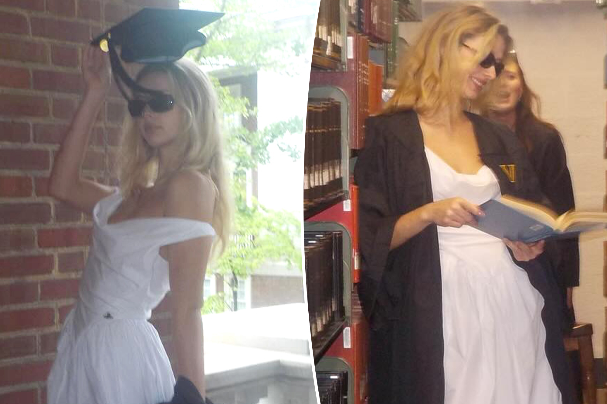 Included in the pics, Martin posed around her college with her friends — lying on leather couches, modeling in the library, and posing with her besties, all in caps and gowns and various white dresses.